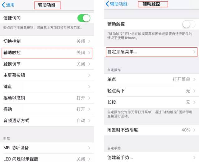 找到【辅助触控】选项,进入【自定顶层菜单】,选择添加一个图标。